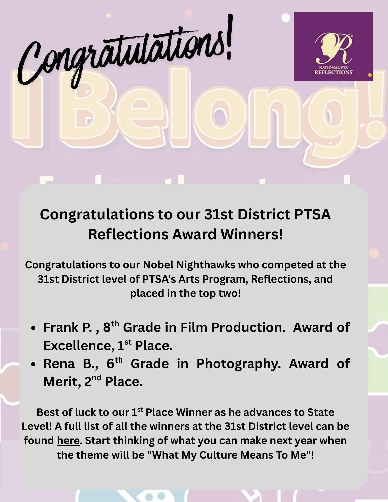 National PTA has a long-standing commitment to arts education. For over 50 years, Reflections has helped students explore their own thoughts, feelings and ideas, develop artistic literacy, increase confidence and find a love for learning. The Reflections program provides opportunities for recognition and access to the arts which boosts student confidence and success in the arts and in life.